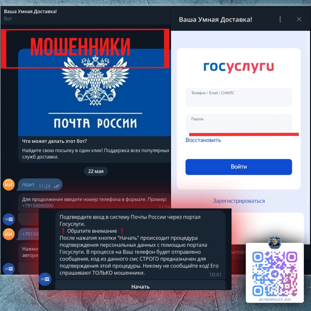 ⬆️Мошенники продолжают подделывать Telegram-боты «Почты России» и компаний доставок. Суть схемы: Звонок от «сотрудника» в мессенджер: гражданину сообщают о «проблеме с посылкой» и просят авторизоваться через Telegram-бот для «исправления ошибки». Фейковый бот: бот с логотипом «Почты России» запрашивает данные для входа в «Госуслуги» или банковские реквизиты. Мини-приложения в Telegram не отображают URL, что усложняет проверку подлинности. Кража данных: введенная информация мгновенно попадает к злоумышленникам, что ведет к взлому аккаунтов, хищению средств или шантажу. Напоминаем: ❗️Сотрудники госслужб не используют мессенджеры для запроса данных. ❗️Официальный бот «Почты России» — @pochta_support_bot. 📲 Вконтакте I 📲 Одноклассники 🇷🇺 Чат-бот Киберполиции России 🫡 Поддержать канал
