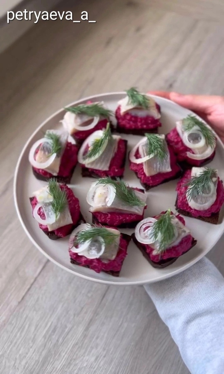 Выложить свекольную массу. Сверху кусочки селёдки, тонкие кольца лука и небольшие веточки укропа.