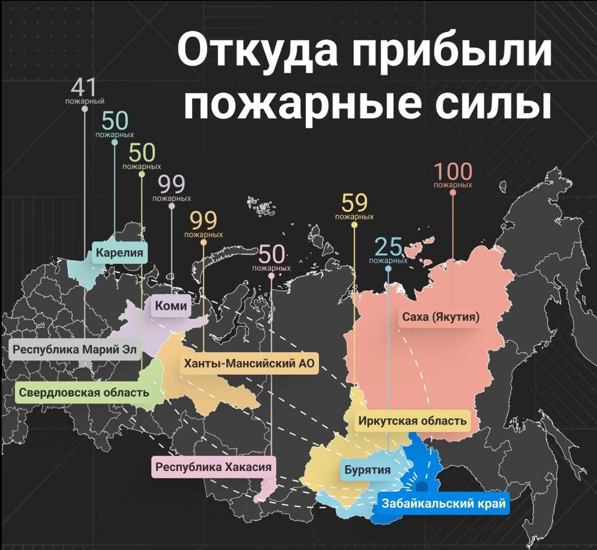 В Забайкалье работают пожарные минимум из 10 регионов. К тушению лесных пожаров в крае привлечены силы из Якутии, Коми, Бурятии, Хакасии, Карелии, ХМАО, Свердловской и Иркутской областей, Приморья и Омска. Динамика прибытия сил: ⏺ 10 мая — 809 человек; ⏺ 15 мая — 847 человек; ⏺ 19 мая — 1 016 человек; ⏺ 23 мая — 1 062 человек. По данным на 23 мая: ⏺ В Забайкалье работают 1 062 парашютиста и десантника. ⏺ Почти столько же пожарных работает и в штатных краевых структурах. Основные районы, где работают силы: Нерчинский, Карымский, Тунгокоченский, Читинский, Хилокский, Чернышевский, Улетовский. По данным Авиалесоохраны 🟦 Подписаться | Предложить новость