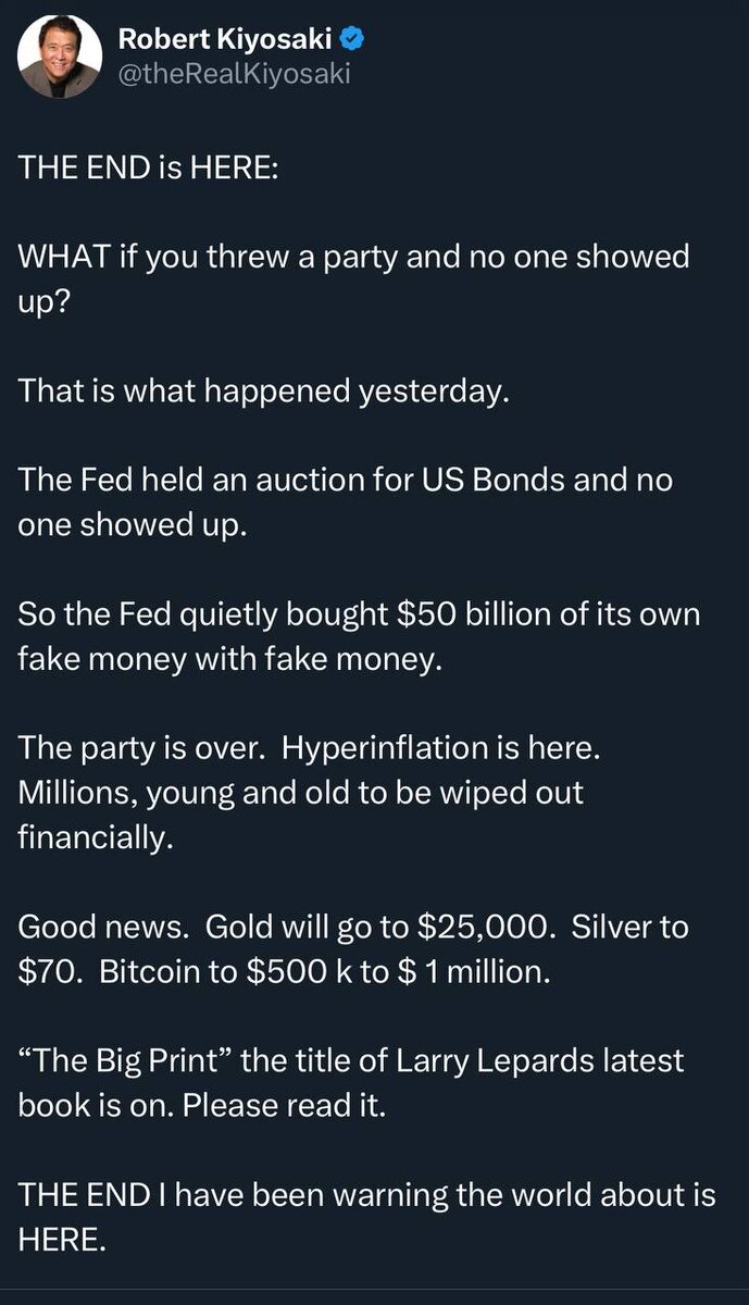 «Праздник закончился». Или почему Кийосаки снова кричит о конце? Инвесторы, вот твит Роберта Кийосаки — человека, который уже не первый год пророчит финансовый апокалипсис. Но давайте разберёмся: эмоции в сторону, факты на стол. Кийосаки утверждает, что ФРС провела аукцион по продаже гособлигаций, и никто не пришёл. А значит, пришлось выкупать самому себе — $50 миллиардов, якобы «фейк мани за фейк мани». Если это действительно так, то это уже не просто техническая операция. Это сигнал, что аппетит к американскому долгу падает. А значит: — иностранные покупатели остывают (включая Японию и Китай), — доходности должны расти, — а значит, давление на банки и экономику США усиливается. Кийосаки делает из этого вывод: гиперинфляция уже здесь. Это спорный момент. Пока реальная инфляция в США замедляется, а данные по CPI и PCE не указывают на гипер. Но вопрос доверия к системе — совсем другое дело. Если инвесторы начнут верить, что долг не погашаем, а печатный станок — единственный выхо