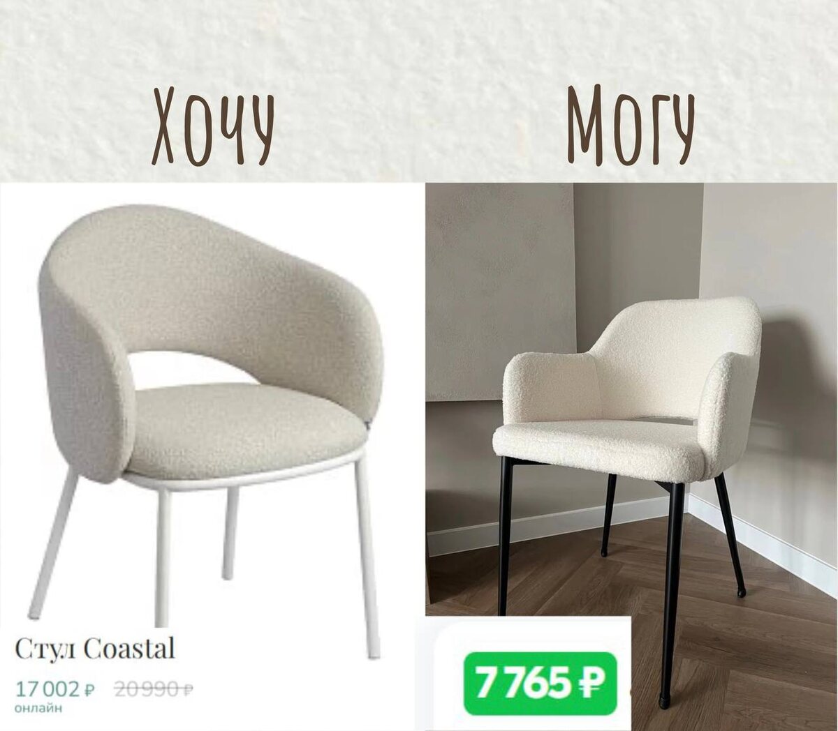 Начинаю утро с любимой рубрики #ХочуМогу Сегодня на повестке — два кресла. Оба стильные, оба мягкие, оба выполнены из металла и фанеры, с приятной на ощупь обивкой из букле. Уютные, универсальные — подойдут для любого интерьера. Разница между ними только в цене. Моё «хочу» за 20 000 рублей легко превращается в «могу» за 8 000 рублей — и это в таком же отличном качестве! Ну скажите, разве не прелесть — два стула по цене одного? А по отзывам на Ozon — кресло действительно классное, и выглядит дорого. Как всегда, делюсь с вами находкой, чтобы экономить не только своё, но и ваше время и бюджет! Артикул на Ozon: 1511895367