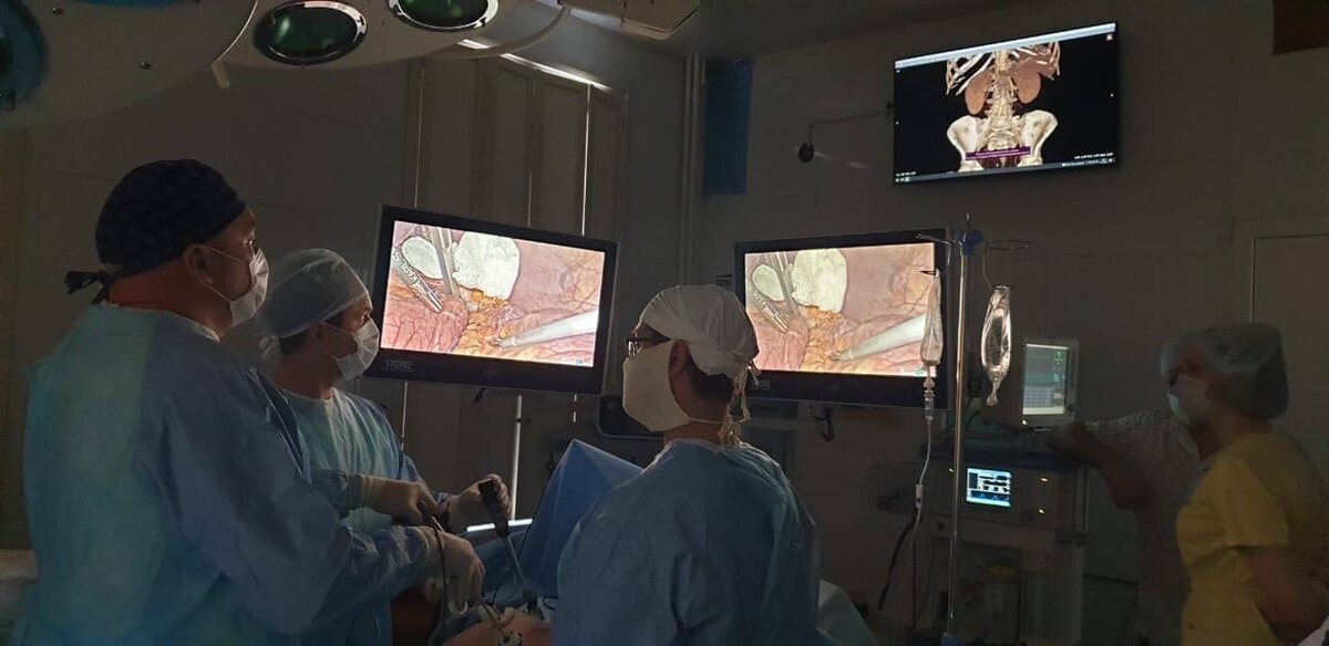 Хирурги областной больницы имени В. И. Войнова впервые в России выполнили сложнейшую операцию с применением двух современных технологий одновременно В Оренбургской областной клинической больнице имени В. И. Войнова при выполнении лапароскопической резекции печени впервые в РФ применена комбинация технологий ICG-навигации и интраоперационной дополненной реальности (AR). Интраоперационная навигация – один из ведущих компонентов хирургической безопасности. Это особенно актуально для высокотехнологичной лапароскопической хирургии (резекция печени, поджелудочной железы, адреналэктомия и т. д.), где вмешательство выполняется в сложной анатомической зоне, что требует четкой идентификации анатомических структур в зоне оперативного действия. AR-технология при резекциях печени, которую внедрили и применяют оренбургские хирурги более трех лет, позволяет создать эффект «прозрачной» хирургической анатомии, когда визуализируются спрятанные в толще тканей органа критически важные сосудистые структ