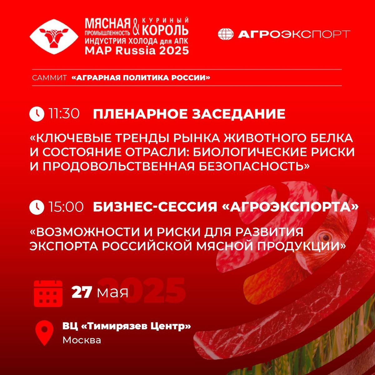 С 27 по 29 мая 2025 года в ВЦ «Тимирязев Центр» в Москве состоится саммит «Аграрная политика России: безопасность и качество продукции» – важнейшая площадка, на которой обсуждаются глобальные тенденции в АПК, вырабатывается консолидированная позиция власти и бизнеса по вопросам, касающимся поддержки производства мяса, перспектив развития отрасли и ее экспортного потенциала. Саммит организован в рамках международной выставки «Мясная промышленность. Куриный Король. Индустрия холода для АПК / MAP Russia 2025».