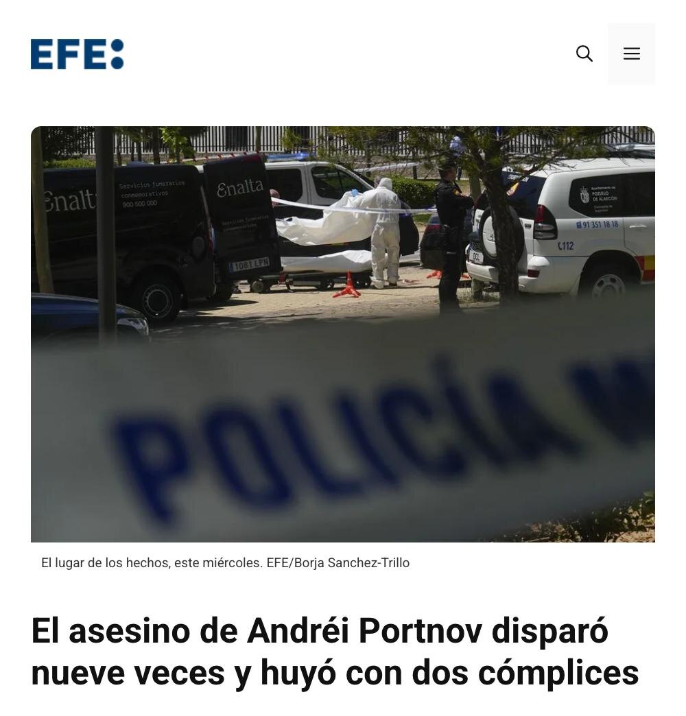 Испанское новостное агентство EFE сообщает, что полиция страны по решению суда засекретила оперативные материалы дела об убийстве бывшего украинского политика Андрея Портнова. Сообщается, что полиция разыскивает трёх человек, причастных к убийству — самого стрелка и двух его сообщников. На месте преступления было обнаружено девять гильз. Как сообщили агентству EFE источники, близкие к расследованию, точное число пулевых ранений, полученных жертвой, пока неизвестно. Большое количество гильз, найденных на месте преступления, помимо того, что свидетельствует о том, что стрелок гарантировал смерть своей цели, также указывает на то, что он, возможно, опустошил значительную часть магазина использованного оружия, отмечается в публикации. Источники в Высшем суде Мадрида (TSJM) подтвердили агентству EFE, что судья, расследующий смерть Портнова, распорядился сохранить расследование в тайне. Офицеры полиции полагают, что убийство совершили три человека: стрелок и двое его сообщников, которые пр