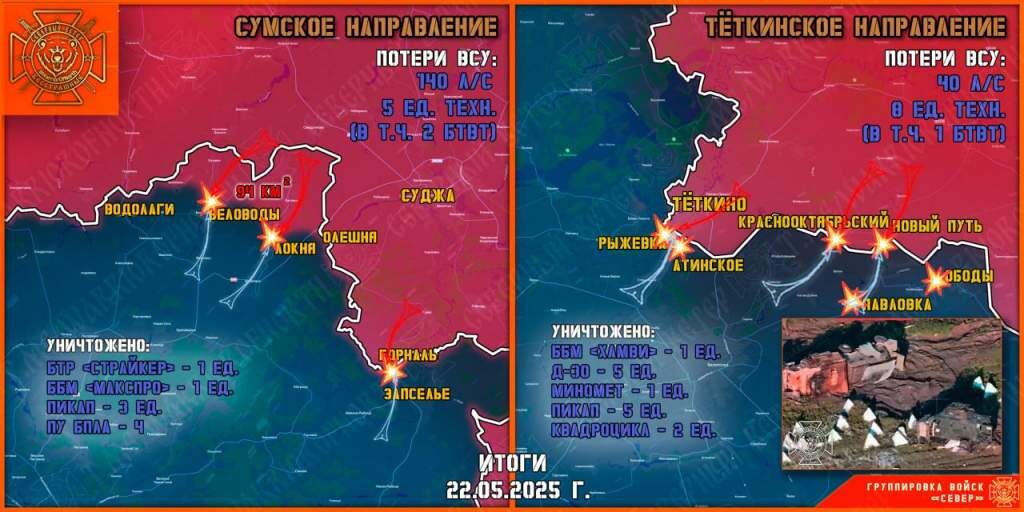 Группировка войск «Север» продолжает отражать попытки прорыва украинских ДРГ на приграничье Курской области. По данным бойцов, противник активно использует штурмовые группы, в том числе сформированные из женщин — бывших заключенных. Как сообщает Telegram-канал «Северный Ветер», 22 мая на направлении Рыжевка — Теткино операторы БПЛА нанесли удар по штурмовой группе ВСУ, уничтожив большинство бойцов, оставшиеся были ранены и остались лежать в лесополосе на границе. На Теткинском и Глушковском направлениях за сутки уничтожены 8 единиц вражеской техники. Также в районе Павловка — Новый Путь была вскрыта группа бойцов 425-го отдельного штурмового полка ВСУ. В результате стрелкового боя большинство нападавших уничтожены, остальные отступили на украинскую территорию. Российские подразделения продолжают формировать зону безопасности в приграничных районах Сумской области.