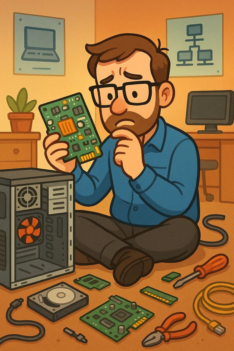 Что внутри компьютера, зачем всё это нужно, и почему сисадмин должен в этом разбираться — даже если он не мастер по пайке и ремонту Если вы думаете о переходе в IT, то скорее всего компьютеры кажутся вам чем-то привычным, но туманным. Вы знаете, где кнопка включения, но что внутри — загадка. А сисадмину это знать надо. Не потому что он «ремонтирует», а потому что понимает, как работает система в целом. Что внутри системного блока (или ноутбука) Компьютер, это не один волшебный ящик. Это набор компонентов, у каждого — своя роль. Вот базовые: Процессор (CPU)