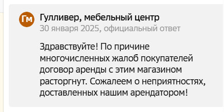 В начале года арендодатель выгнал «ТД Магистраль» из торгового центра. Администрация мебельного центра «Гулливер» в социальных сетях объяснила это решение недовольством покупателей.
