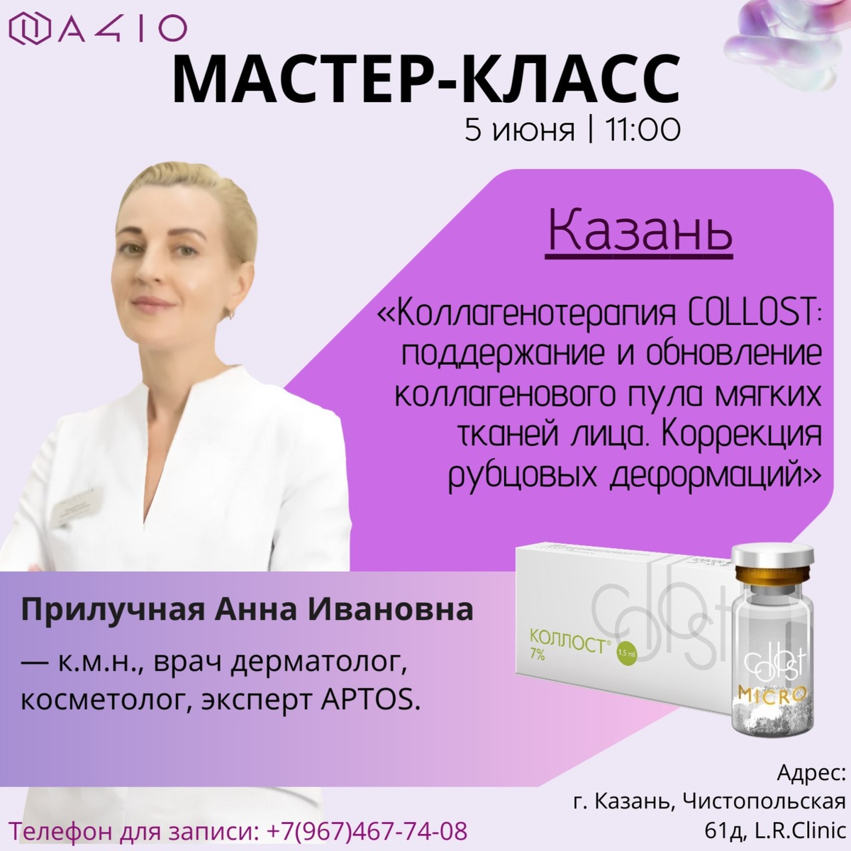 💞МАСТЕР-КЛАСС COLLOST®️ в Казани💞 Тема: «Коллагенотерапия COLLOST®️: поддержание и обновление коллагенового пула мягких тканей лица. Коррекция рубцовых деформаций» 📅 Дата: 5 июня 🕙 Время: 11:00 📍Место: г. Казань, Чистопольская 61д, L.R.Clinic 🗣️ Спикер: Прилучная Анна Ивановна — к.м.н., врач дерматолог, косметолог, эксперт APTOS. ✍ Программа: 11.00–13.00 Теоретическая часть: * Физиология коллагена в кожных структурах. * Виды коллагена и их функции * Причины дефицита коллагена * COLLOST® коллаген * Механизмы действия препарата * Показания и возможности применения COLLOST® 13.00–13.30 Кофе-брейк. 13.30–15.30 Практическая часть. ✨ Условия участия уточняйте у менеджера. ⭐️ Зарегистрироваться можно по номеру: +7(967)467-74-08 📲 или на сайте: A410.ru ⚡️Для получения полного прайс-листа переходите по ссылке 👉🏻 http://clck.ru/38NMpp