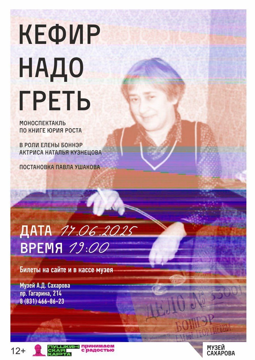 Моноспектакль «Кефир надо греть» проспект Гагарина, 214 14 июня 2025, 19:00-21:00 Моноспектакль поставлен по одноименной книге «Кефир надо греть». «У нее была своя жизнь, но мы связываем судьбу Елены Георгиевны Боннэр с великим российским гражданином Андреем Дмитриевичем Сахаровым. Как-то летом я пришел на сахаровскую кухню и предложил Боннэр вспомнить всю ее жизнь с Сахаровым. Честно.» (с) Это история о любви двух людей, история сугубо частной жизни, наполненной поэзией в условиях тотальной «слежки» и «прослушки». В центре спектакля образ Елены Боннэр, которая 19 лет прожила с Андреем Сахаровым и почти 7 лет из них в городе Горьком. #яместный