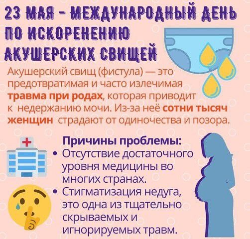 ☀️ Доброго утра! 🩺 23 мая — Международный день по искоренению акушерских свищей Резолюция ООН от 5 марта 2013 года напомнила миру о проблеме, которая в XXI веке не должна существовать — но всё ещё существует. Акушерские свищи — это тяжёлые послеродовые травмы. Они возникают, когда во время затяжных и осложнённых родов женщина не получает квалифицированной помощи. Из-за длительного давления на ткани таза развивается ишемия и некроз, и образуется фистула — канал между влагалищем и мочевым пузырём или прямой кишкой. Последствия: • постоянное недержание мочи или кала • хронические инфекции • боль, стыд и изоляция • утрата ребёнка в родах — почти всегда • обвинения от семьи вместо поддержки Почему это до сих пор происходит? • бедность • отсутствие доступа к медицине • детские браки • ранние беременности • низкий уровень просвещения в вопросах репродуктивного здоровья В развитых странах акушерские свищи — редкость. В бедных регионах — реальность тысяч женщин. Решение? • доступ к качес