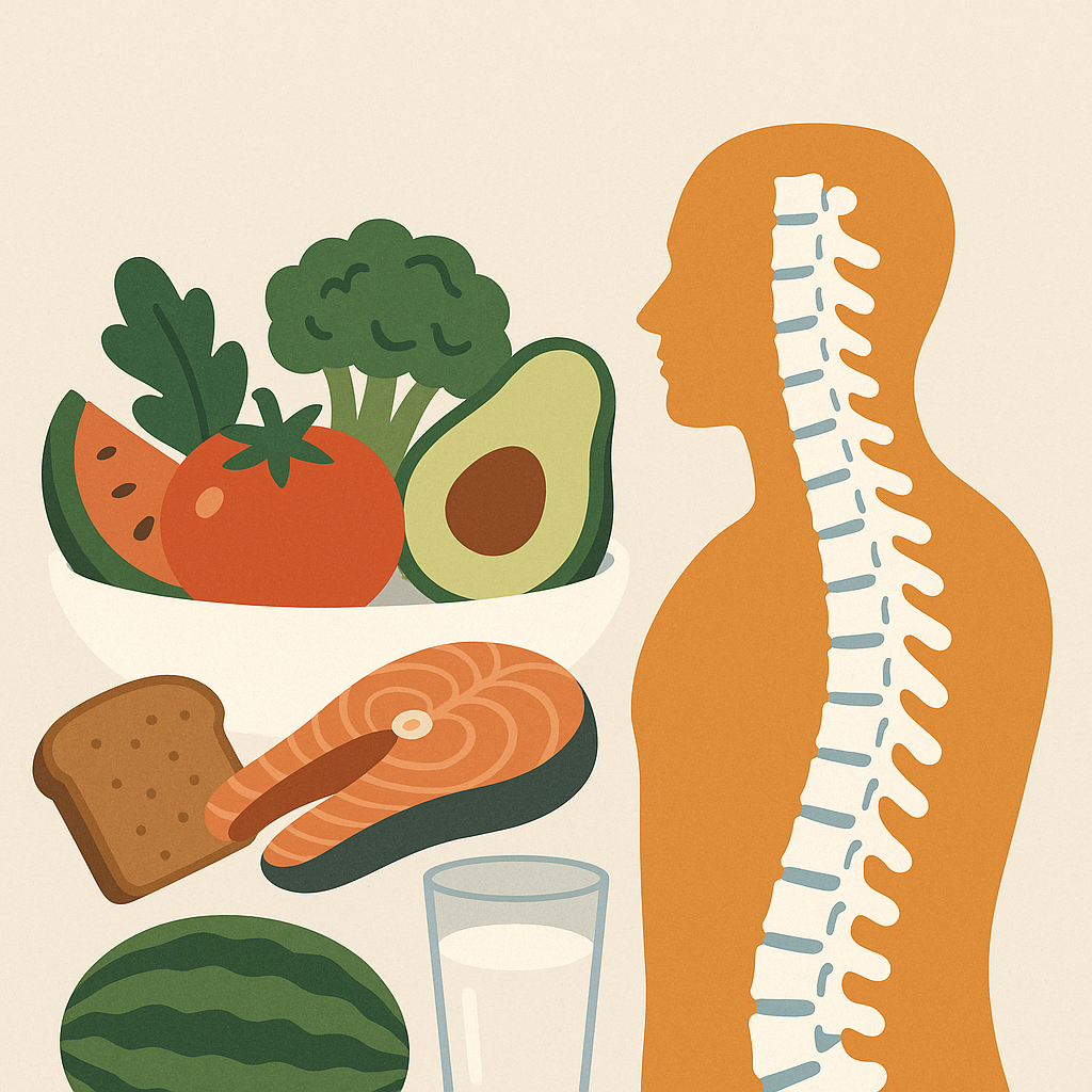 Здоровье позвоночника напрямую влияет на ваше самочувствие и активность. Знаете ли вы, что правильное питание способно не только облегчить симптомы, но и предотвратить проблемы с позвоночником? В этой статье вы узнаете, как диета помогает поддерживать здоровье спины и какие продукты стоит включить в рацион. Позвоночник — это сложная структура из костей, хрящей и связок, которая нуждается в питательных веществах для прочности и гибкости. Неправильное питание, лишний вес или дефицит витаминов могут ускорить износ межпозвоночных дисков, усилить воспаление и ухудшить кровообращение. Сбалансированная диета укрепляет кости, поддерживает мышцы и помогает бороться с хроническими болями. 1. Белки для мышц и тканей Постное мясо, рыба, яйца и бобовые — источники белка, необходимого для укрепления мышц спины и восстановления хрящей. Омега-3 жирные кислоты в лососе или скумбрии снимают воспаление при радикулите или артрозе. 2. Кальций и витамин D для костей Молочные продукты, кунжут, миндаль и лист