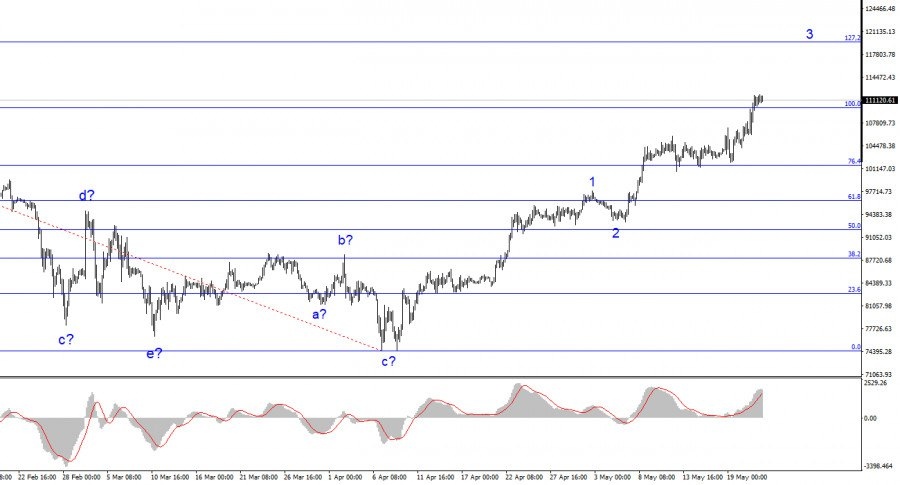 Волновая разметка 4-часового графика для инструмента BTC/USD немного усложнилась. Мы увидели коррекционную нисходящую структуру, которая завершила свое построение около отметки 75000$. После этого началось довольно сильное повышение, которое может быть импульсным повышательным трендом. Вторая волна этого участка приняла очень малый и совершенно неубедительный вид, но спрос на биткоин продолжает расти, что является признаком «пампа».