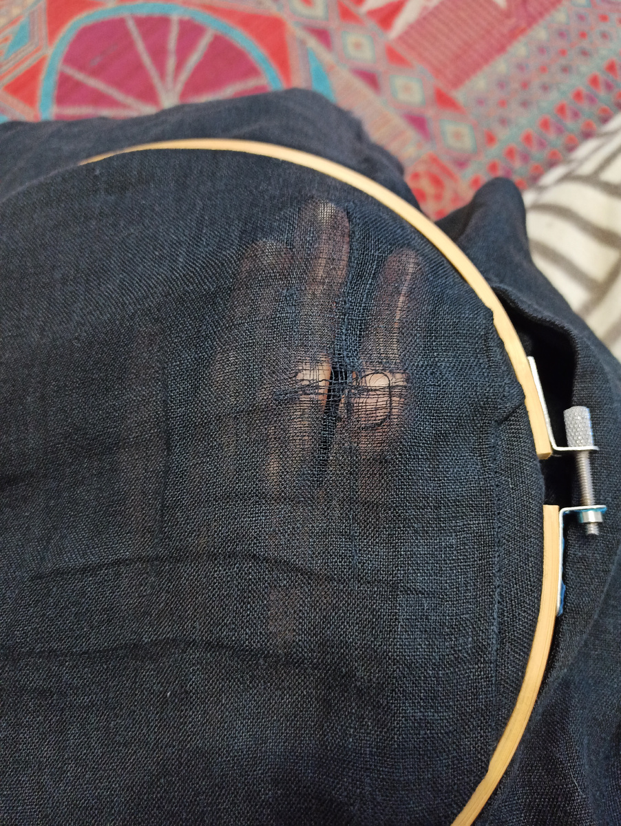 Занималась такой штопкой впервые, ниток для штопки не было. Сначала пыталась из подгиба штанины доставать, но оттуда нитей мало и они короткие. И сам край не хотелось лохматить. Нашла дома отрез чёрного ситца и из него нитки вытаскивала - они хоть и тоньше, но вполне подошли для работы.