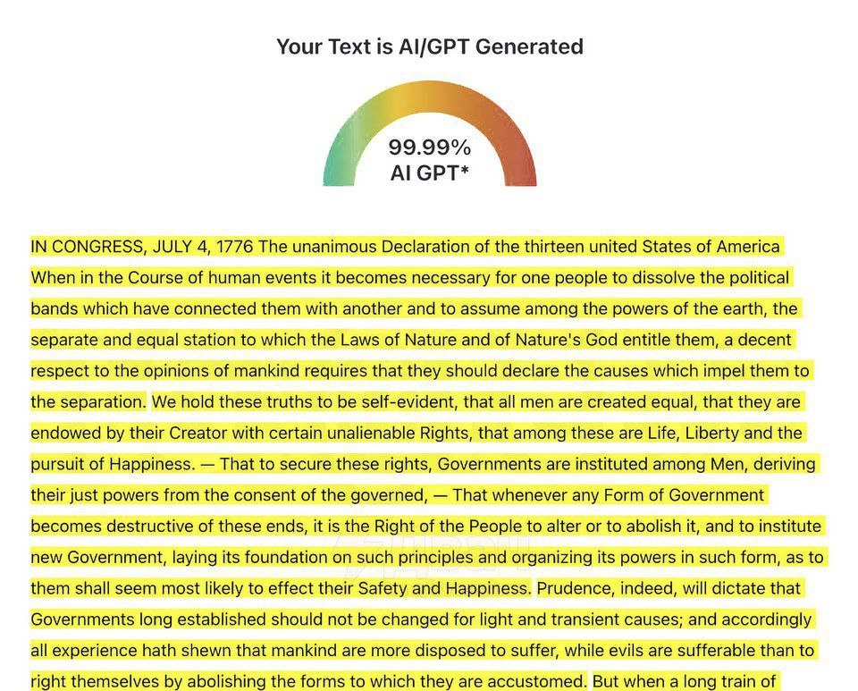Мы живём в матрице, официально: детектор нейротекста проверил Декларацию независимости США и решил, что её… написала нейросеть. Результат — 99,99% текста сгенерировал ИИ. Получается, двести лет назад отцы-основатели не стали долго думать и попросили ChatGPT написать этот документ за них.