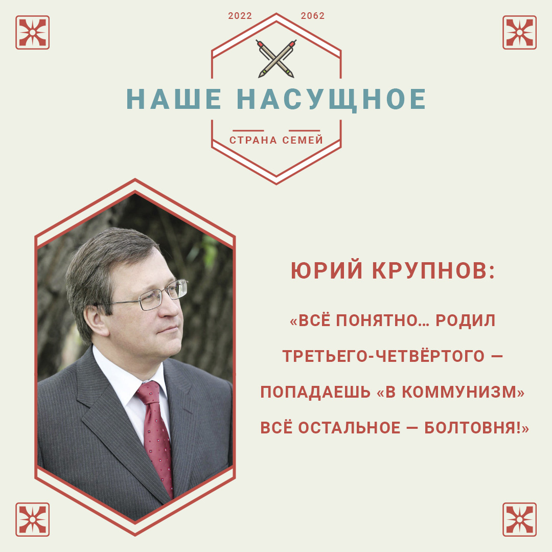 Но выход есть — смотри в конце материала. Член Редакторского комитета Общественного доклада «Путь в Россию — Страну Семей», демограф Юрий Крупнов, отмечает, что сейчас с медленной депопуляцией сталкивается не только наша страна, но и всё человечество. — В целом всё человечество тоже уже практически перестало и через 10 лет формально перестанет воспроизводиться. Даже в Нигерии и Афганистане если 20 лет назад было условно 7 детей на семью, то сегодня уже 4–5. То есть везде падает рождаемость. В Китае, который мы обычно приводим как показатель «бездны народа, который девать некуда», который заселит весь мир, сегодня население условно 1,4 миллиарда. Но уже началось снижение численности, и к концу столетия прогнозируют спад населения до 800 миллионов в Китае. То есть такое же уполовинивание. В Японии ситуация ещё хуже. — Россия перестала осуществлять простое демографическое воспроизводство в 1964 году. В прекрасном брежневском СССР начались эти проблемы. Расцвет, стабильность, вера в завтра