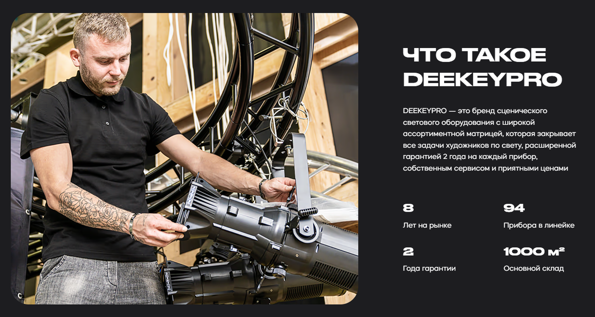 DEEKEYPRO производитель светового оборудования Вы экономите до 20% бюджета, благодаря ценам производителя Вся техника продается прямо со склада без розничной наценки. В 2017 году компания Про-Сцена запустила собственный бренд светового оборудования. DEEKEYPRO не уступает аналогам по качеству, сроку службы и гарантии, но при этом заметно дешевле