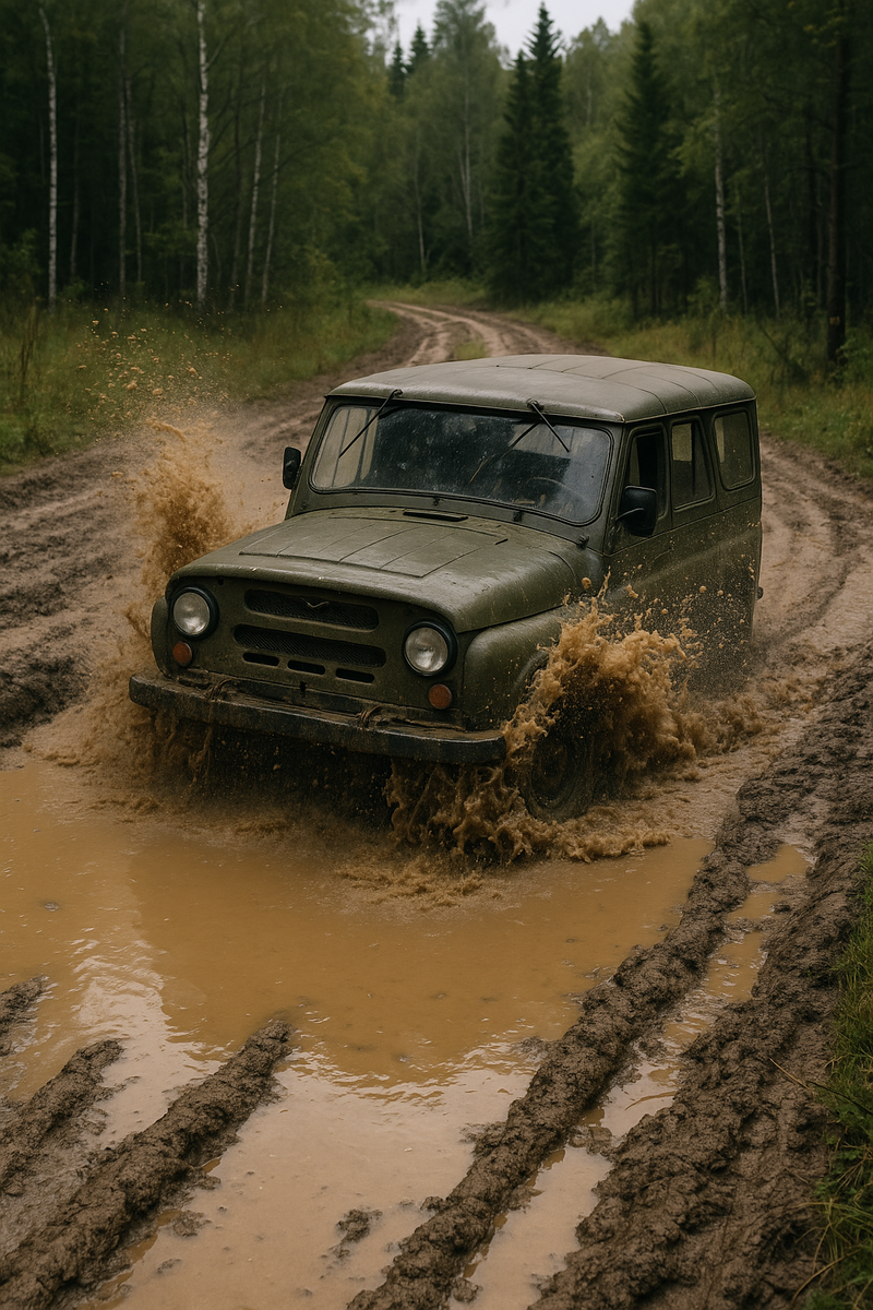 На 12-м километре лесной просеки водитель предпринял манёвр “в лужу — с разгону”.