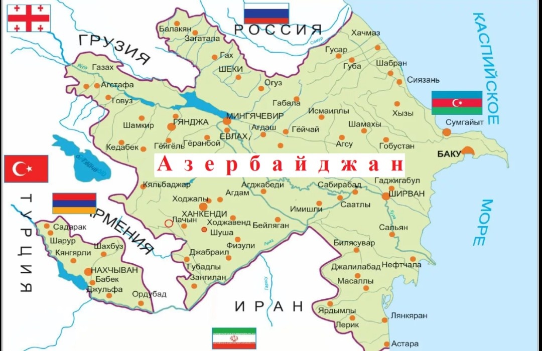 Рассмотрим карту Азербайджана. Азербайджан граничит с Российской Федерацией, Грузией, Арменией, Турцией и Ираном, в Каспийском море морские границы Азербайджана с РФ и Ираном. Азербайджан делится на провинции: Шеки-Загатала, Куба-Хачмаз, Апшерон-Кизи, Бакинский, Ленкорань-Астара, Ширван-Сальян, Горный Ширван, Центральный Аран, Миль-Мугхан, Карабах, Восточный Зангезур, Казак-Товуз, Гянжа-Дашказан, Нахчиван. Достаточно Восточные наименования. Города Азербайджана, начнём с городов региона Баку, Апшерон-Кизи и Куба-Хачмаз: Баку, Сумгаит, Алят, Хырдалан, Хызы, Сиязань, Шаран, Хачмаз, Гусар, Губа. Города регионов Ленкорань-Астара, Ширван-Сальян и Миль-Мугхан: Астара, Ленкорань, Лерик,Ярдамлы, Джалильабад, Масалы, Нефтчала, Сальян, Ширван, Гаджигабул, Сабирабад, Саатлы, Биласувар, Имишли. Джалильабад до 1967 года звали Астрахан-Базар в честь того, что в этом регионе приняли людей из Астрахани, после взятия в 1554 году Русскими войсками Ивана Грозного города Астрахани, к тому же город Астра