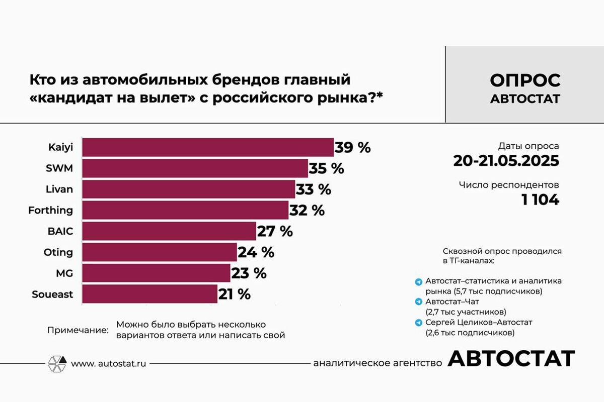 Россияне назвали китайские автобренды, которые, по их мнению, являются главными кандидатами на вылет с российского авторынка. Соответствующий опрос был проведен в Telegram-каналах агентства «Автостат». «По мнению аудитории, самые большие шансы покинуть российский авторынок есть у Kaiyi (39%), SWM (35%), Livan (33%) и Forthing (32%). В опросе приняло участие 1104 человека», — сообщает директор агентства Сергей Целиков. Он отметил, что в качестве вариантов ответа были предложены восемь брендов с минимальными объемами продаж на один дилерский центр. При этом в опрос не включались марки, которые лишь недавно появились в РФ. Мария Жандарова
