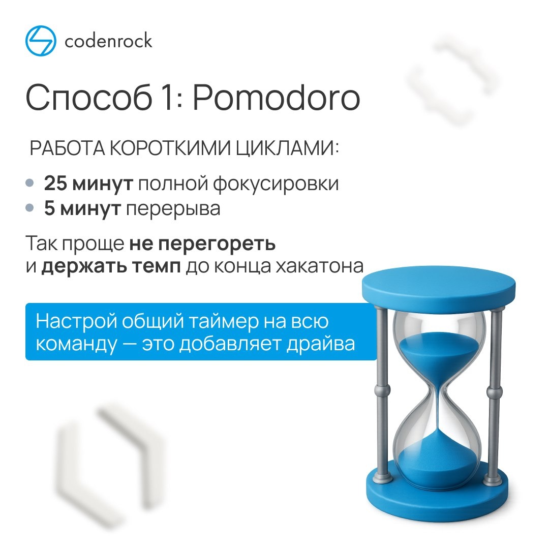 3 способа управлять временем на хакатоне На хакатоне времени всегда меньше, чем кажется. Спешка, хаос, потерянные задачи — стандартный сценарий без управления процессом. Собрали короткую инфографику: 🔹 Как не утонуть в задачах. 🔹 Как работать в темпе. 🔹 Как дойти до питча без нервов. Не важно, какую технику выберете, главное — помнить: на хакатоне ценится не только идея, но и умение быстро довести ее до рабочего результата. 📎 Сохраняй — пригодится перед следующим стартом.