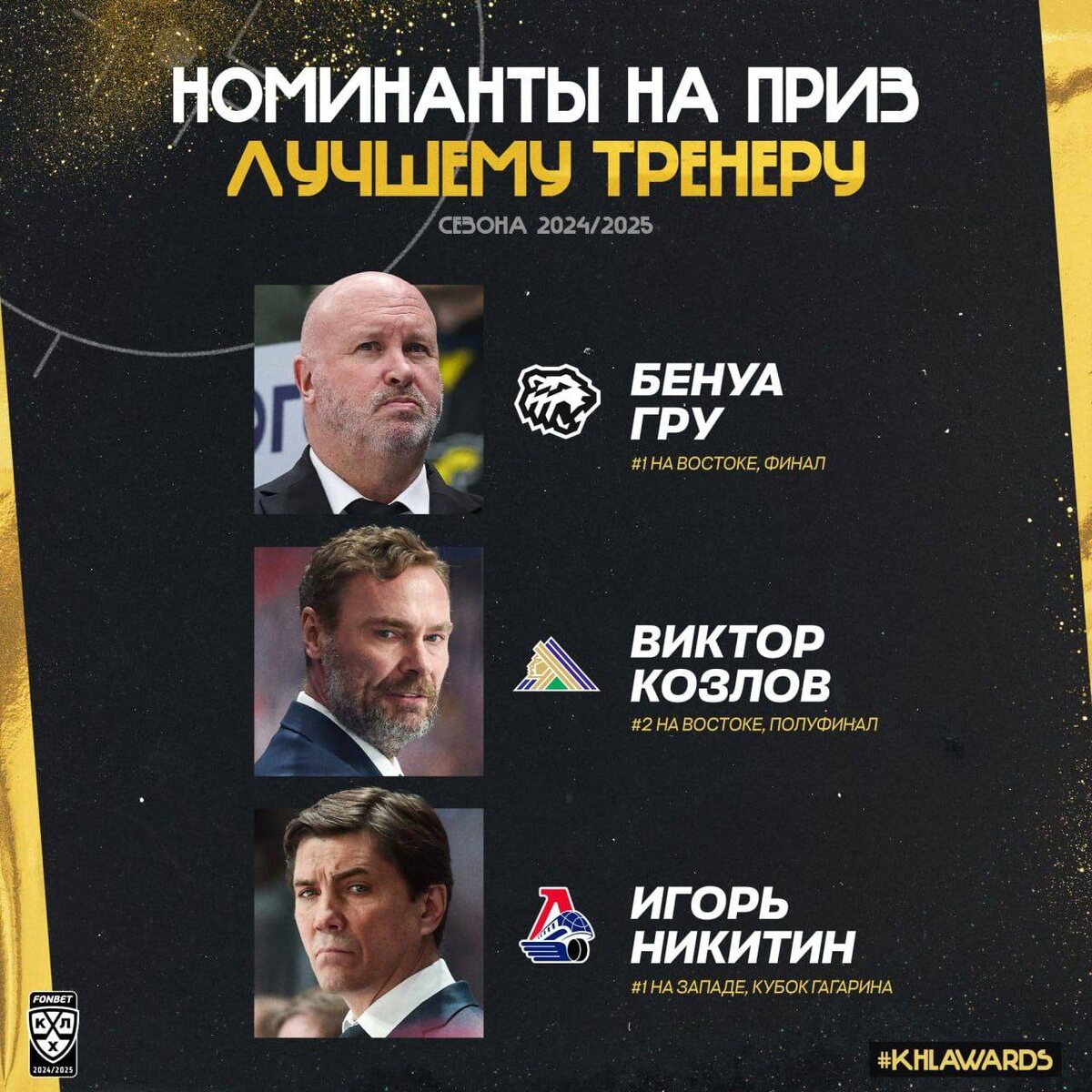 🔝 КХЛ объявила тройку номинантов на приз лучшему тренеру по итогам сезона-2024/25