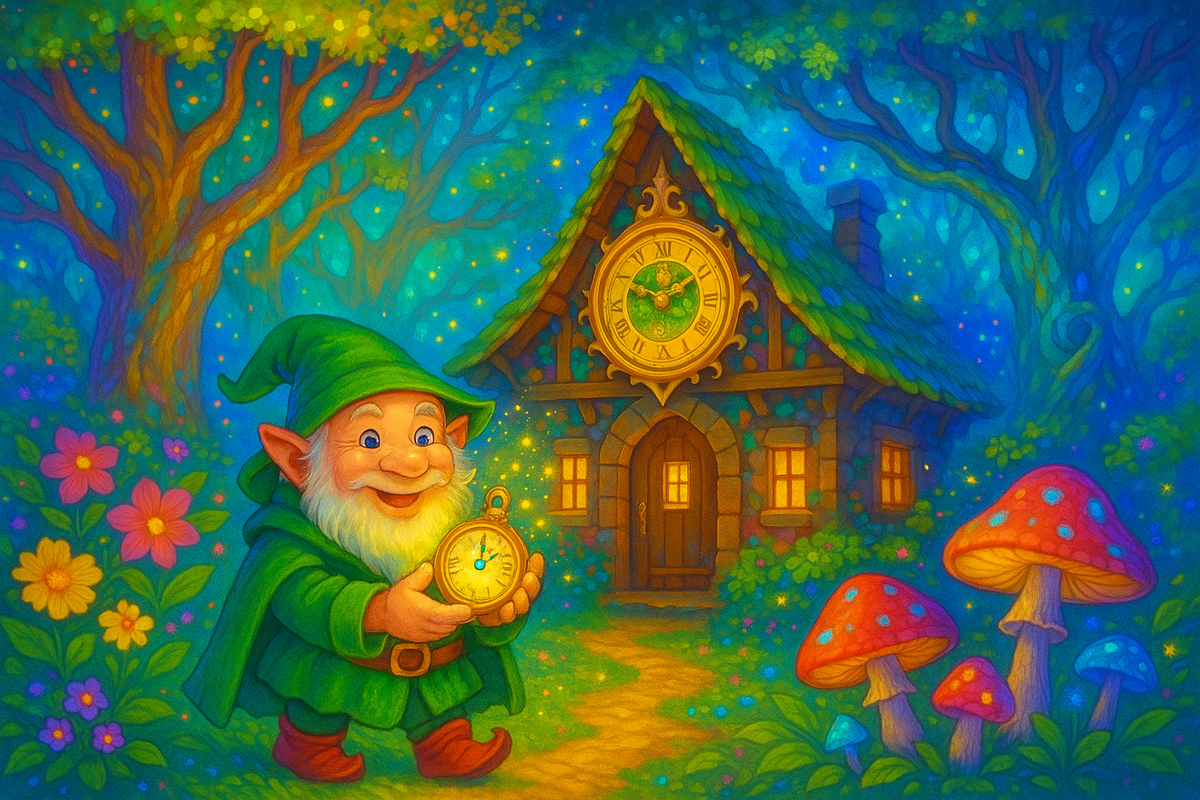 # Мастер Эльрик и его верный спутник В глубине Туманного леса, где корни древних дубов переплетаются с нитями времени, стоит небольшая хижина, которую обычные смертные никогда не найдут. Здесь живет мастер Эльрик — последний из рода гномов-хранителей магических часов. Каждый вечер, когда стрелки на старинных часах приближаются к полуночи, Эльрик садится за свой потертый деревянный стол для особого ритуала. Рядом с ним устраивается Теневик — его кот-фамильяр, черный как сама ночь, с изумрудными глазами, в которых отражается свет магических кристаллов. — Ну что, старый друг, — шепчет Эльрик, наливая в фарфоровую чашку дымящийся напиток цвета лунного света, — время проверить, как течет магия в нашем мире. Теневик мурлычет в ответ и касается лапой небольшого серебряного блюдца. Мгновенно по воздуху разливается аромат звездной пыли и высушенных лепестков роз, собранных в полнолуние. Напиток в чашке Эльрика — не простой чай. Это отвар из листьев Древа Познания, растущего на границе миро