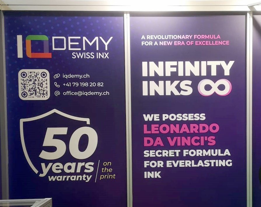 Вроде бы кажется, что добиться действительно стоящих инноваций в УФ печати уже нельзя, как что-то новенькое постоянно появляется. Вот есть у существующих ультрафиолетовых чернил ограничение по выцветанию, у всех плюс минус одно. По документам цвет будет держаться 2-3 года на улице. По факту бывает, что и дольше и меньше служит на улице печать без деградации цвета (плюс минус пару лет). Но сейчас все больше запросов идет для применения печати на улице с гарантией 10-20 лет (стандартный срок в индустрии строительства и отделки). Стандартные чернила с такой задачей могут справится при использовании дополнительного защитного лака, который наносится аналоговым способом, и гарантию уже должен давать производитель лака, а этот вопрос «сложный» и ответственность в этом случае размывается на нескольких поставщиков. На последней самой крупной рекламной выставке FESPA 2025 в Берлине. IQDEMY продемонстрировала УФ чернила INIFINITY inks (фотография с выставки как раз). С гарантией на отпечаток от