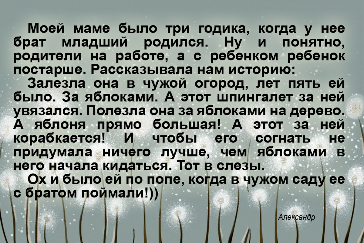 -Мама, можно я с подружками в песочнице поиграю? -У тебя что дел дома нет? -Но я же сама маленькая, мне всего 3 года. -А сестре твоей еще меньше! И снова здравствуйте. Нашел вот у себя в закромах. Классные, кстати истории. Да и время было классное! Хотя в детстве любое время самое лучшее! Я сам был сначала лялькой, а потом и нянькой. Нянькой, если честно очень обидно! Твои друзья товарищи с мечом бегают, а ты ребенка укачиваешь, пока его родители куда отлучились. А если гулять - то сзади хвост из двух племянников - погодок. Никуда от них не спрячешься! Теперь вон какие дядьки выросли! У одного четверо детей!)) И вот уже с его детьми такое счастье повозиться!)) У моей бабушки было 7 детей. А в годы войны их было трое. Мама моя вторая, с 37-го, а младший в 41-м родился, за 3 месяца, как отца в июне в армию призвали.. Старшему было семь лет. А на нем вскопка огорода в 15 соток, посадка картошки и за младшими следить. Прибежит бабушка с работы затемно, что-то там приготовит, а с петухами