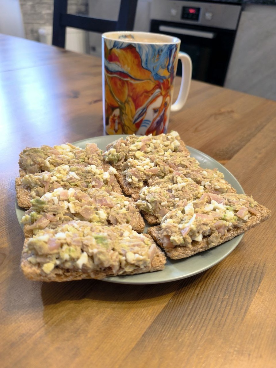 Завтрак на 50г белка. Хлебцы с тунцом, карпаччо из индейки, авокадо, яйцом и кофе с молоком.