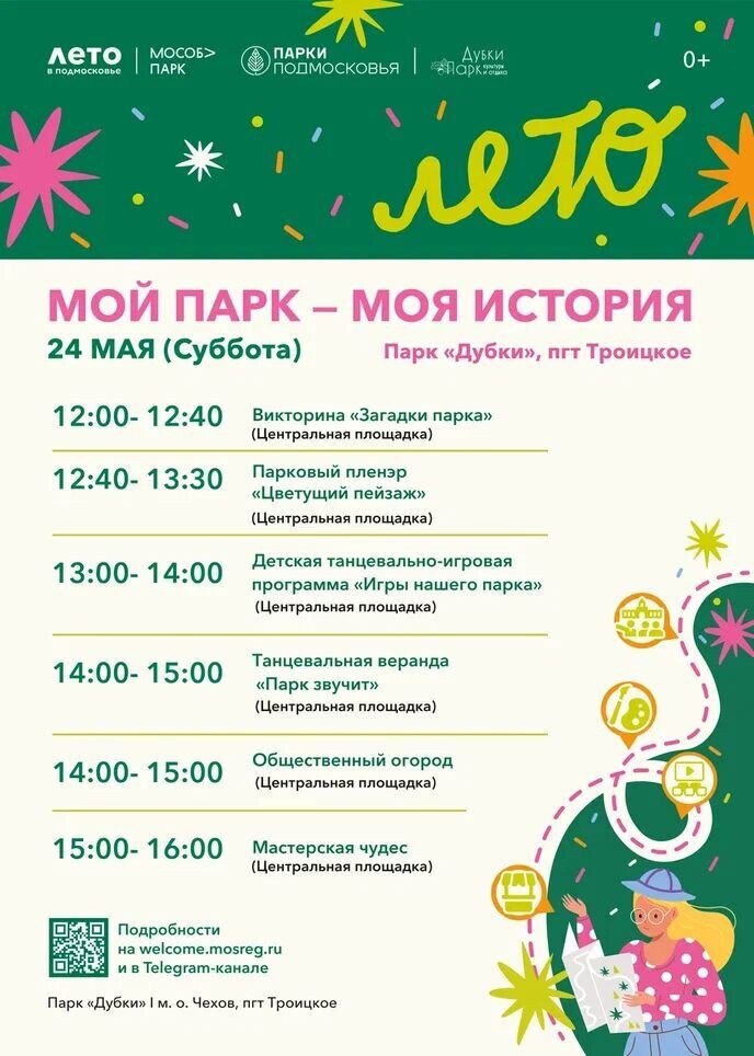 ✨ МОЙ ПАРК - МОЯ ИСТОРИЯ в парке Дубки 🔹12:00 - 12:40 Викторина "Загадки парка" (центральная площадка) 🔹12:40–13:30 Парковый пленэр "Цветущий пейзаж" (центральная площадка) 🔹13:00 - 14:00 Детская танцевально-игровая программа "Игры нашего парка" (центральная площадка) 🔹14:00 - 15:00 Танцевальная веранда "Парк звучит" (центральная площадка) 🔹14:00 - 15:00 Общественный огород (центральная площадка) 🔹15:00 - 16:00 Мастерская чудес (центральная площадка) 🚫 Возраст: 0+ 📆 24.05.2025 🕛 12:00 🏢 Парк культуры и отдыха «Дубки» 📍 г.о.Чехов, с.Троицкое, парк "Дубки" 🪙 Вход свободный❗️ #webЧехов ✅ Мероприятия Чехов https://dzen.ru/id/66cc4b48e9ef144699238a51 http://vk.com/chekhov_events http://dzen.ru/chekhov_events