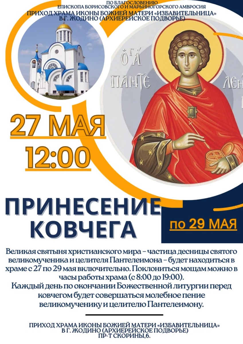По благословению епископа Борисовского и Марьиногорского Амвросия в храм иконы Божией Матери «Избавительница» г. Жодино (Архиерейское подворье) 27 мая 2025 года в 12:00 будет принесена частица десницы святого великомученика и целителя Пантелеимона. Великая святыня христианского мира – частица десницы святого великомученика и целителя Пантелеимона – будет находиться в храме с 27 по 29 мая включительно. Поклониться мощам можно в часы работы храма (с 8:00 до 19:00). Каждый день по окончании Божественной литургии перед ковчегом будет совершаться молебное пение великомученику и целителю Пантелеимону.