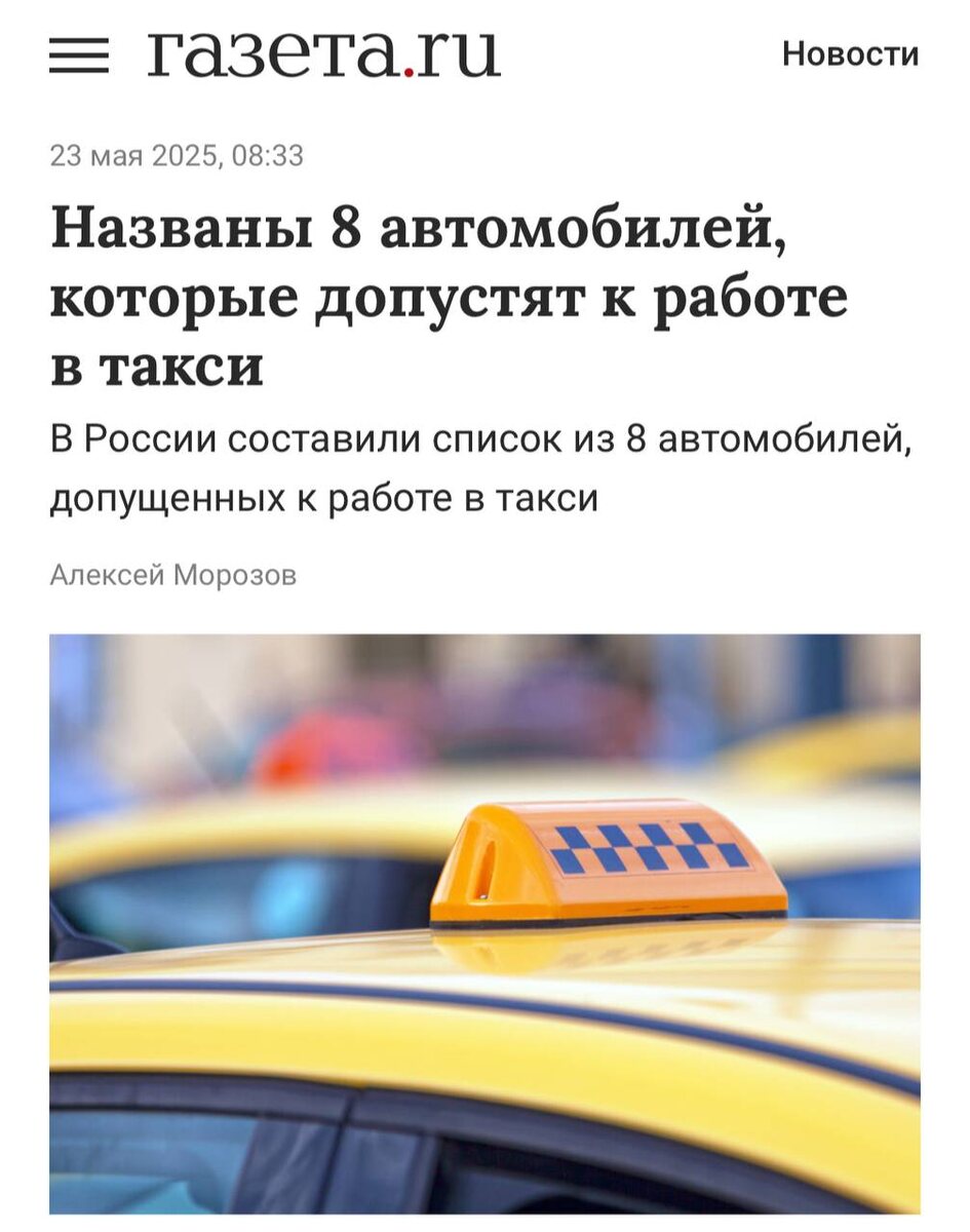 В России утвердили перечень автомобилей для работы в такси — основной акцент на отечественные и китайские марки Министерство транспорта официально утвердило список моделей, которые теперь можно использовать в качестве такси. В перечень вошли преимущественно автомобили Lada и китайского производства. Утверждённые модели: - Lada Granta - Lada Vesta - Lada Aura (новая флагманская модель) - Haval F7/F7x - BAIC U5 Plus - Kaiyi E5 Что это значит для рынка? - Сохранятся категории «Эконом» и «Комфорт» - «Бизнес»-класс пока остаётся под вопросом — возможны дополнительные ограничения - С лета 2026 года вступят в силу новые правила, что может привести к росту стоимости поездок Почему именно эти авто? 1. Поддержка отечественного автопрома — львиная доля списка отдана Lada 2. Доступность запчастей — китайские модели постепенно наращивают сервисную сеть в РФ 3. Экономичность — все утверждённые модели отличаются низкой стоимостью эксплуатации Эксперты прогнозируют,