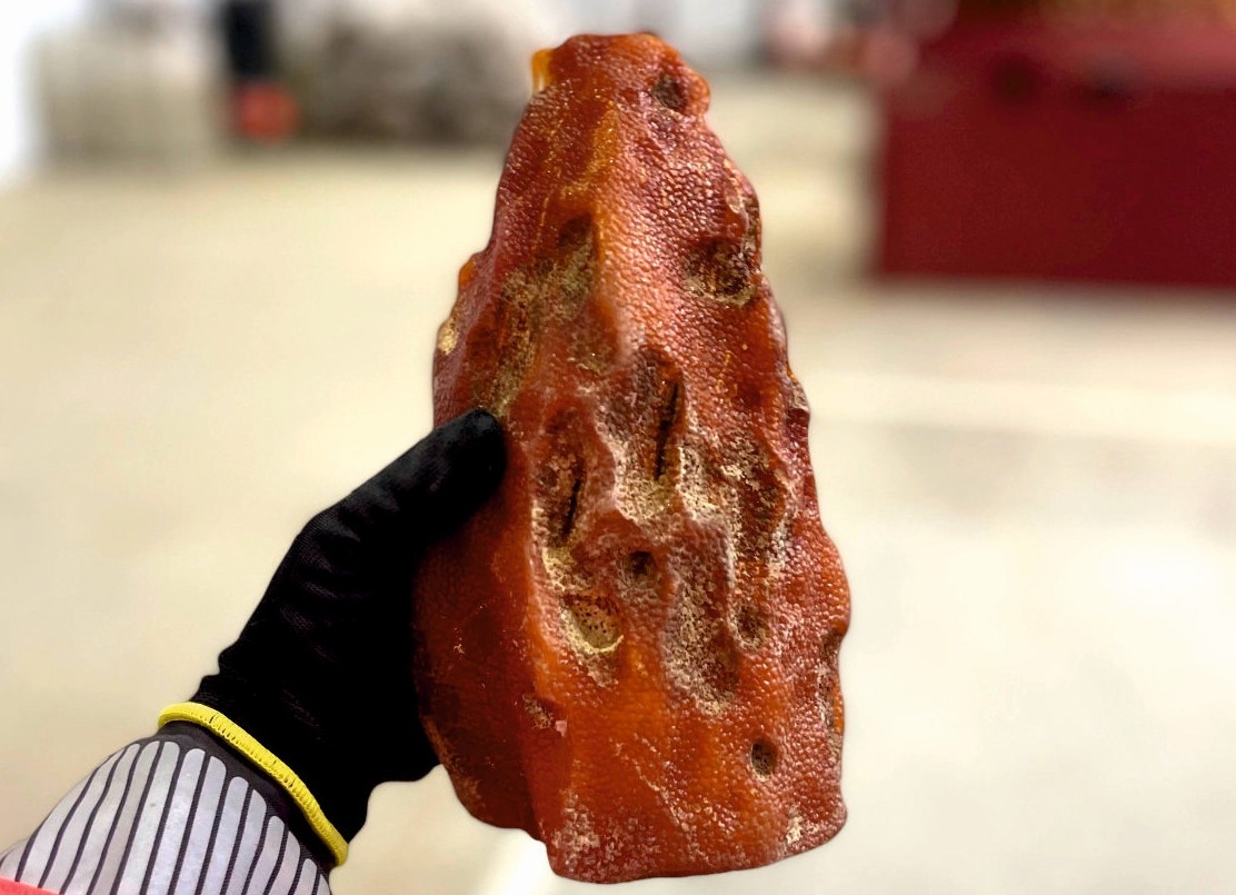 Образец балтийского янтаря весом 1082 грамма добыли в Приморском карьере. По оценкам специалистов, возраст самородка составляет от 35 до 45 млн лет. Камень желтого оттенка и необычной треугольной формы обладает плотной пористой структурой. Он прекрасно сохранился и имеет всего один боковой скол.