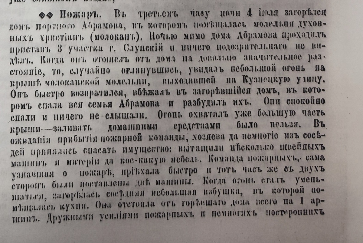 Когда он отошел от дома на довольно значительное расстояние, случайно оглянулся и увидел небольшой огонь на крыше молоканской молельни, выходившей на Кузнечную улицу. Пристав Слунский «быстро возвратился, вбежал в загоревшийся дом, в котором спала вся семья Абрамова и разбудил их. Они спокойно спали и ничего не слышали. Огонь охватил уже большую часть крыши – заливать домашними средствами было нельзя. В ожидании прибытия пожарной команды, хозяева да немногие из соседей принялись спасать имущество: вытащили несколько швейных машин и материи да кое-какую мебель. Команда пожарных, сама узнавшая о пожаре, приехала быстро и тот час же с двух сторон были поставлены две машины. Когда огонь стал уменьшаться. Загорелась соседняя небольшая избушка, в которой помещалась кухня. Она отстояла от горящего дома всего в 1 аршине. Дружными усилиями пожарных и немногих посторонних лиц огонь был потушен и крыша разобрана менее чем в полчаса.