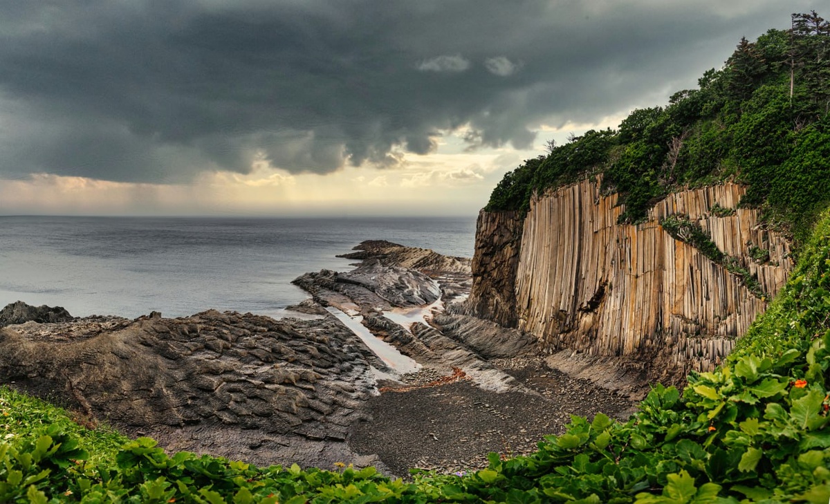 Так часто называют мыс Столбчатый — одну из самых необычных локаций Курил. Его скалы будто сложены из гигантских шестиугольных труб — совсем как у старинного органа. Давным‑давно вулкан Менделеева извергал андезитовые и дацитовые лавы, которые стекали в Охотское море. Остывшая лава сформировала скалы из многогранных колонн, высотой до 40 метров. На мысе есть свои «архитектурные» формы: Мостовая — словно выложенная вручную дорога Орган — вертикальные колонны, уходящие в небо Бастион — массивный выступ, будто созданный для обороны Черепаха — округлая форма, напоминающая панцирь Когда поток лавы начинает остывать — наружные слои застывают первыми, а внутренние еще остаются горячими. В процессе охлаждения в породе возникают трещины, образуя аккуратные колонны — чаще всего шестиугольной формы. Такое явление встречается в мире нечасто — его можно увидеть в России, Исландии, Шотландии, Ирландии и США. Мыс Столбчатый — один из самых ярких примеров. Мыс находится на острове Кунашир, куда можно
