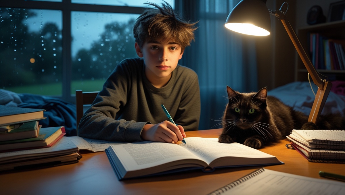 Сейчас октябрь, опять дождь за окном. Но я не иду гулять под дождем без цели. Сижу дома, делаю доклад по истории. Сажа лежит на столе рядом с учебниками, иногда лапой трогает ручку.