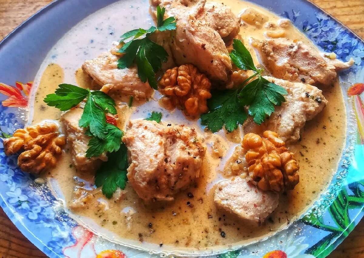 Куриное филе с грецким орехом — это блюдо, которое сочетает в себе нежное куриное мясо и аромат грецких орехов. Оно может быть как основным блюдом, так и частью более сложного меню. Куриное филе — это белое мясо, которое содержит мало жира и много белка. Грецкие орехи придают блюду особый вкус и аромат. Они богаты полезными жирами, витаминами и минералами. Ингредиенты: Приготовление: Куриное филе нарезать небольшими кусочками. Лук очистить и нарезать кубиками. Чеснок очистить и мелко нарезать или пропустить через пресс. Грецкие орехи измельчить ножом или в блендере. На сковороде разогреть растительное масло и обжарить лук до золотистого цвета. Добавить куриное филе и обжаривать до золотистой корочки. Добавить чеснок, соль, перец и специи, хорошо перемешать. Добавить измельчённые грецкие орехи и обжарить всё вместе ещё несколько минут. Приятного аппетита!