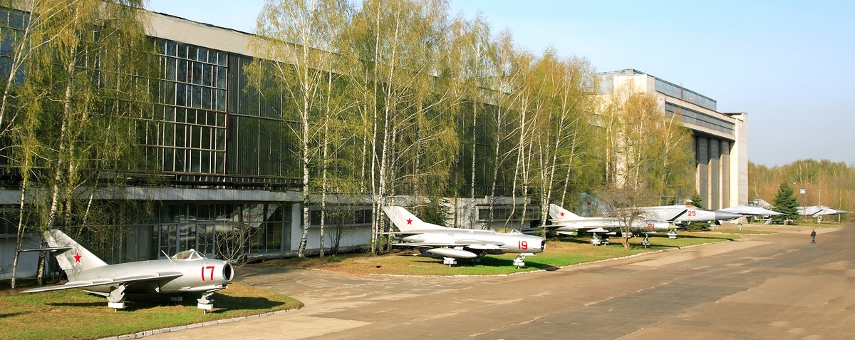 На улице, вдоль одного из главных сборочных цехов выставлена линейка реактивные самолётов «МиГ».