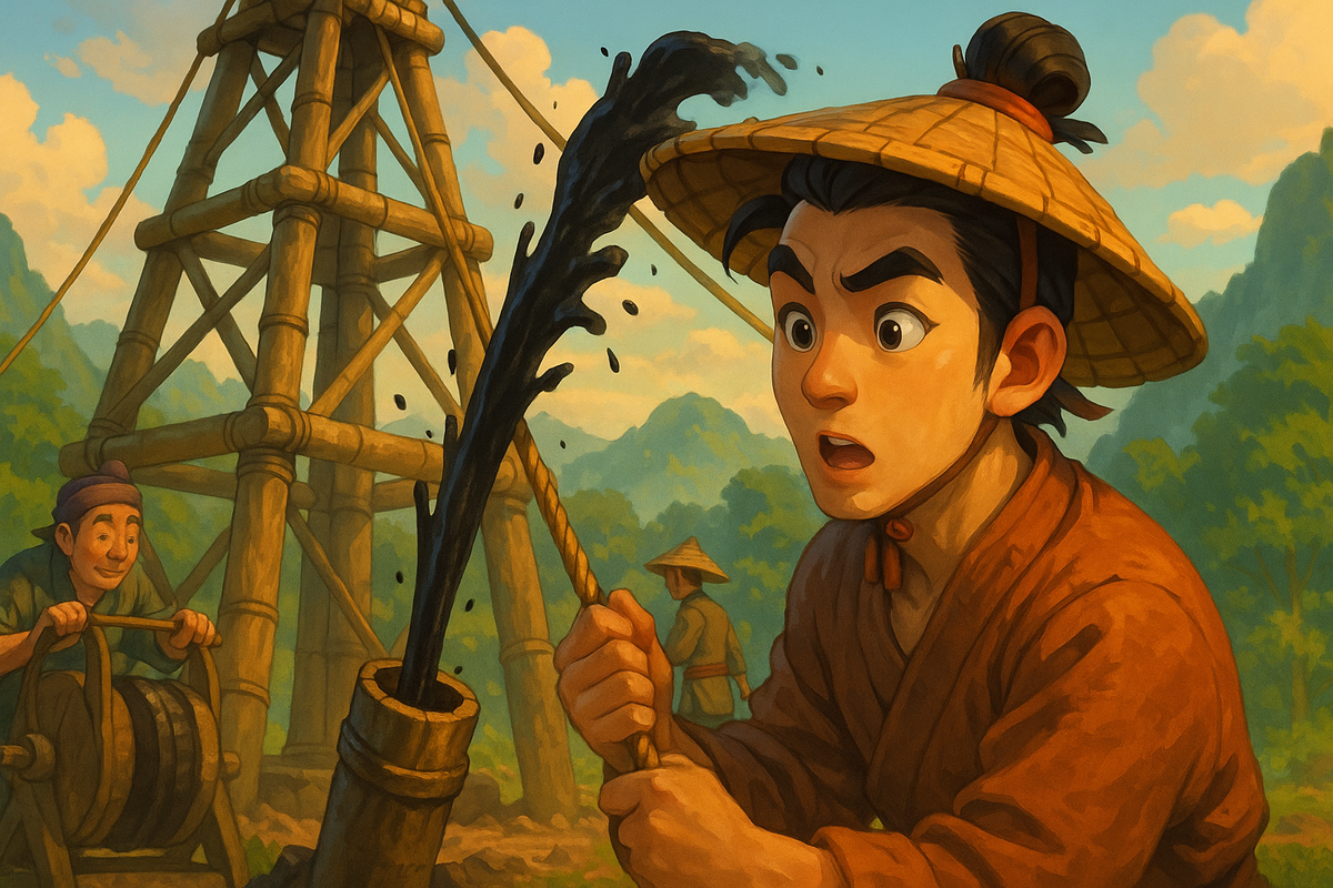 Окей, забудьте всё, что вы знали о нефти. Не Рокфеллер, не Техас, не чёрное золото 19 века. А теперь внимание: 347 год нашей эры, Китай, провинция Сычуань — бурят нефть. Серьёзно. Причём не просто ковыряют землю, а строят полноценную буровую установку. Из бамбука.