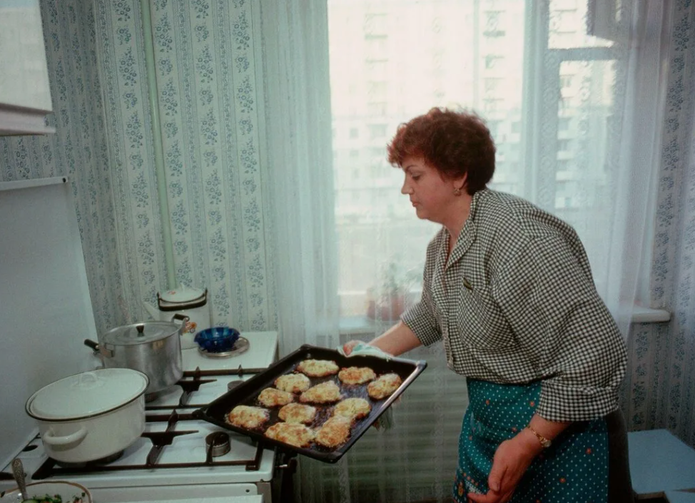 Причём речь не шла о простом супе или жареной картошке: к столу нужно было подать первое, второе и, если повезёт, даже компот или запечённый пирог. Продуктов было немного, рецепты приходилось придумывать на ходу, а полуфабрикатов просто не существовало. На всё это уходило два-три часа, после чего начинался новый этап — мытьё посуды, полностью вручную, с хозяйственным мылом, в холодной воде, без всякой надежды на помощь от супруга.