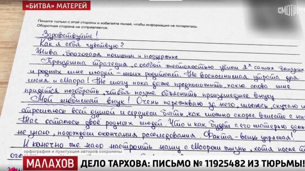 С февраля не утихают разговоры об убийстве четы Тарховых. Внучка экс-мэра Самары Екатерина обвиняется в убийстве родных бабушки и дедушки. Предполагаемый мотив – корысть. Останки Натальи и Виктора Тарховых до сих пор не найдены. Людмила Тархова, мать Екатерины, написала в редакцию Первого канала письмо из колонии, где отбывает срок за вымогательство. Вот, что она написала: «Здравствуйте. Как я себя чувствую? Жива. Благодаря помощи и поддержке. Произошла трагедия. С особой жестокостью убили двух самых близких и родных мне людей. Моих родителей. Невосполнимая утрата для меня и Маора. Не могу пока даже предположить, какие слова мне придется подобрать, чтобы позже объяснить произошедшее внуку. Мой любимый внук. Очень переживаю за него. Молюсь, скучаю, стремлюсь и душой, и сердцем быть как можно скорее вместе с ним. Нас осталось двое родных людей. Что и как будет с его матерью дальше, не знаю. Подождем окончания расследования. Факты — вещь упрямая. И, конечно же, надо настроить нашу с Маоро