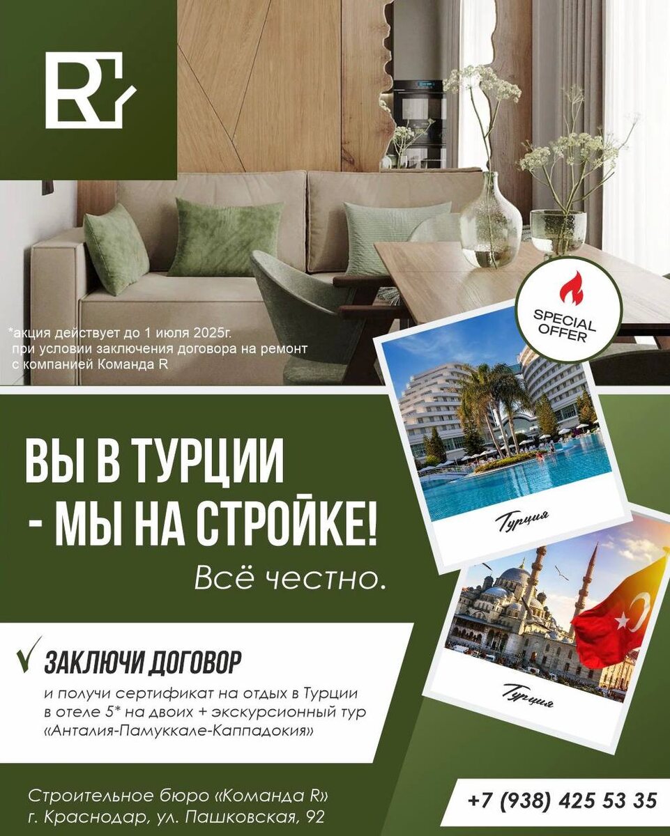 Мы знаем, как важен комфорт в вашем доме. Ремонт – это не только обновление пространства, но и возможность создать уют, который будет радовать вас каждый день. Мы стремимся, чтобы этот процесс приносил только положительные эмоции и проходил без лишних забот. Поэтому у нас для вас особый подарок!✨ Только до 01.07.2025 при заказе дизайнерского ремонта в строительном бюро «Команда R» вы получите сертификат на недельный отдых в солнечной Турции на двоих! Вас ждёт незабываемый экскурсионный тур по маршруту «Анталия-Памуккале-Каппадокия» с профессиональным гидом, проживание в отелях класса 5*, вкусные завтраки (шведский стол) и море впечатлений!😍 Мы гарантируем качество и соблюдение сроков! Не упустите шанс воспользоваться этим уникальным предложением – количество путевок ограничено! Как получить подарок?