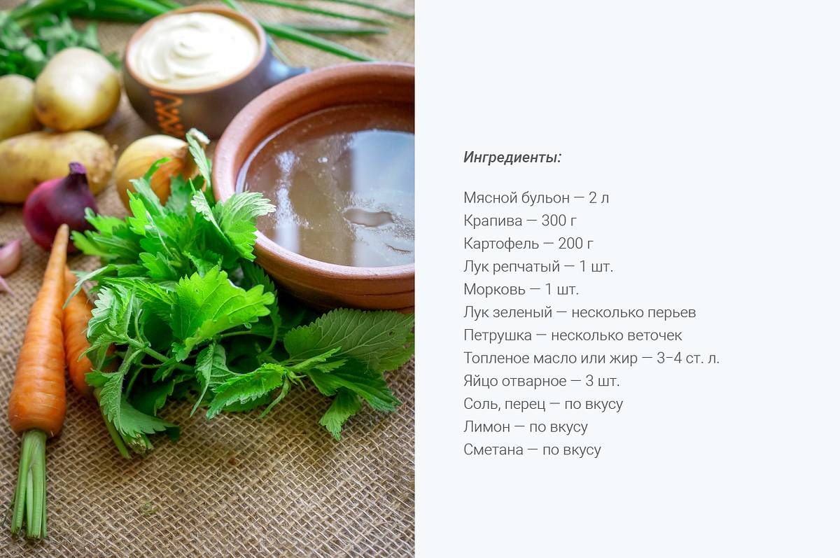 Готовый бульон разогреваем на плите. Отправляем в бульон предварительно нарезанный небольшими кубиками картофель. В отдельной сковороде разогреваем топленое масло и обжариваем на нем нарезанный на средние кубики репчатый лук и морковь, натертую на крупной терке. Вместо топленого можно использовать сливочное или растительное масло. Когда картофель размягчится, добавляем в бульон зажарку и варим 5−7 минут, затем досыпаем зелень — мелко покрошенные крапиву, зеленый лук и петрушку. Добавляем соль и перец по вкусу. Убавляем огонь до минимума и варим суп еще пять минут. Суп подается заправленным свежей сметаной и с половиной сваренного вкрутую яйца. Можно также выжать в тарелку немного лимонного сока: кислинка оттеняет вкус и аромат крапивы.