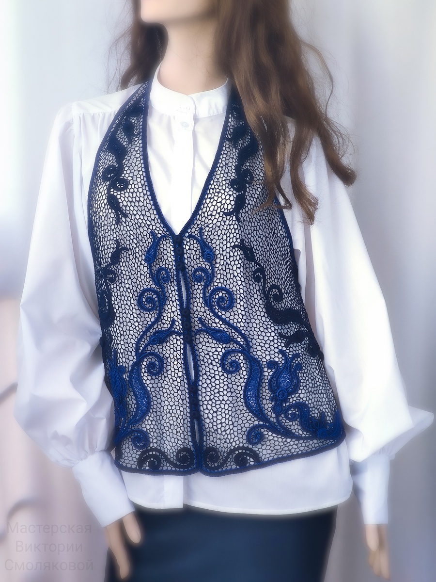 Он связан крючком из натурального шёлка в стиле арт кружева. На этом фото жилет накинут на плечи. Смотрится интересно. Идея на будущее. Обратите внимание на вязаные пуговицы Спинка В этой статье можно посмотреть про пряжу из которой связан жилет Как же вяжется такое кружево Сначала вяжем элементы композиции Пример вязания элемента Можно посмотреть в статье пример сборки кружева на плоскости по круговому принципу На каждое изделие мастерской создаю подробные пошаговые мастер классы в различных форматах: мастер классы в пдф мастер классы в группах вконтакте а также по ежемесячной подписке вконтакте есть практически все курсы мастерской, обзор на которые можно посмотреть в статье навигаторе вконтакте Благодарю за внимание! Лайк и комментарий греют душу мастера