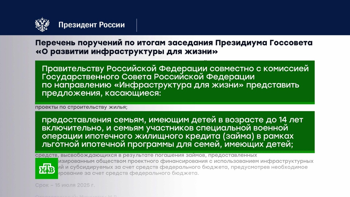 [ Смотреть видео на сайте НТВ ] Владимир Путин выпустил ряд поручений правительству и Центробанку, касающихся жилищного строительства. В частности, он велел разработать предложения по дифференцированному увеличению лимитов по «Семейной ипотеке» в зависимости от количества членов семьи. Владимир Путин поручил правительству разработать предложения по дифференцированному увеличению лимитов по «Семейной ипотеке». Об этом говорится в перечне поручений, опубликованных на сайте Кремля. Документ был подготовлен по итогам заседания президиума Госсовета «О развитии инфраструктуры для жизни». Увеличивать лимиты займов предлагается, исходя из количества членов семьи. Ответственными назначены премьер-министр Михаил Мишустин и глава Республики Татарстан Рустам Минниханов, срок — до 15 июня. Такой же дедлайн установлен правительству и Центробанку для выполнения ряда поручений, связанных с кредитами на жилье. В частности, им необходимо разработать меры, которые бы исключили ситуации, когда банки берут