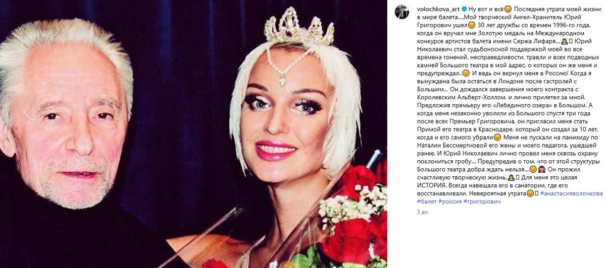 "Григорович был последний человек, кто держал плеяду артистов в театре. Кого вы теперь знаете, какую прима-балерину? А я вам скажу — никто никого не знает, потому что там никого нет. Я смотрю на происходящее и думаю, люди добрые, неужели это все правда! Я не верю своим глазам, до чего все дошло. Ужас какой-то, не верится!" — заключила Анастасия, буквально предрекая конец света для всего балета.