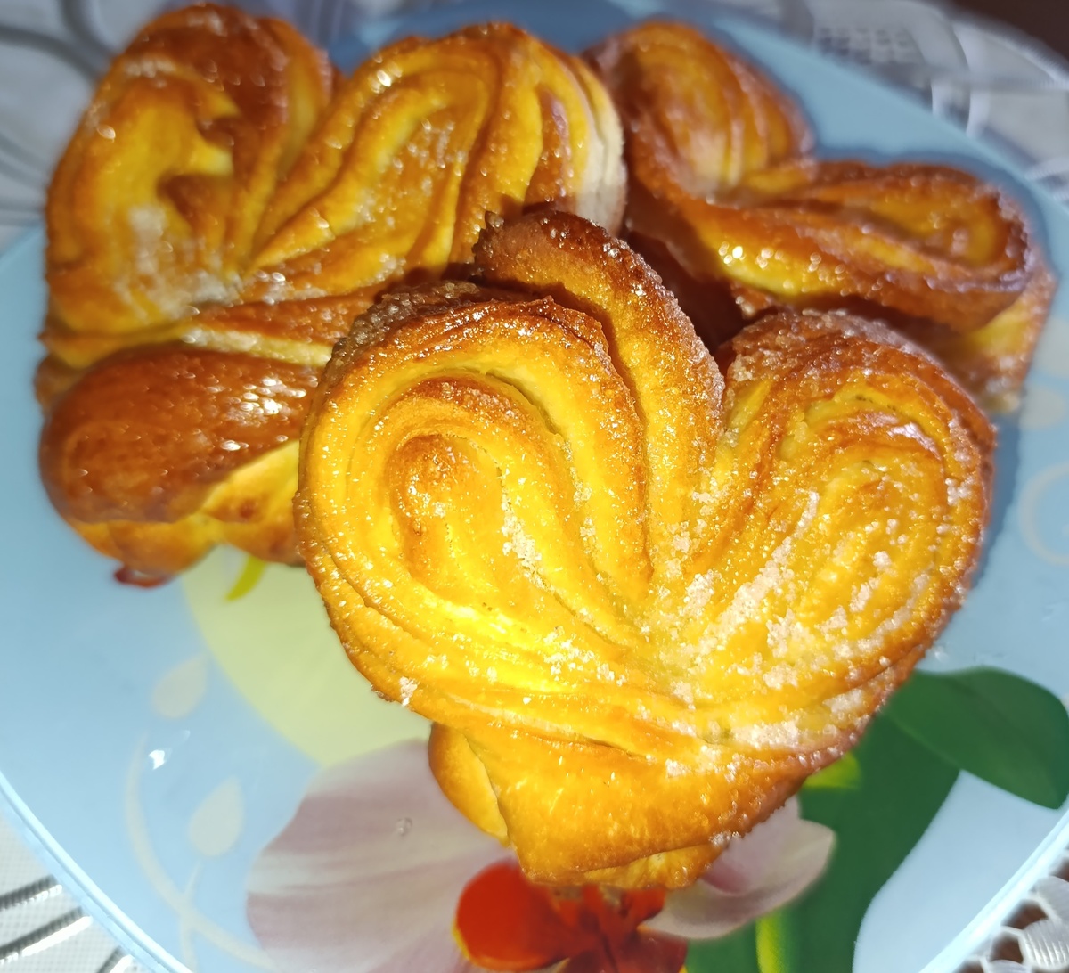 Ингредиенты: молоко 150 гр мука 500 гр вода 70 гр дрожжи 1 пак яйцо 1 шт сахар 100 гр масло сливочное 100 гр соль 1 ч л Дрожжи залить теплым молоком и дать постоять 15 минут до образования шапочки. Добавляем воду, соль, 2 ст л сахара, яйцо и муку. Замешиваем тесто. Накрываем пищевой пленкой и ставим в теплое место на 50 минут. Готовое тесто разделяем на несколько частей. У меня получилось 12 заготовок. Тонко раскатываем каждый кусочек в заготовку приблизительно прямоугольной формы. Масло растапливаем. Смазываем маслом поверхность заготовки и посыпаем сахаром (1 ч л). Сильно маслом смазывать не нужно иначе булочки будут плоскими. Скатываем заготовку. Соединяем концы. Переворачиваем наш бублик Разрезаем и разворачиваем. Смазываем наш противень маслом и выкладываем булочки. Смазываем яичным желтком. Запекаем при 170 градусах 25 минут. Приятного аппетита.