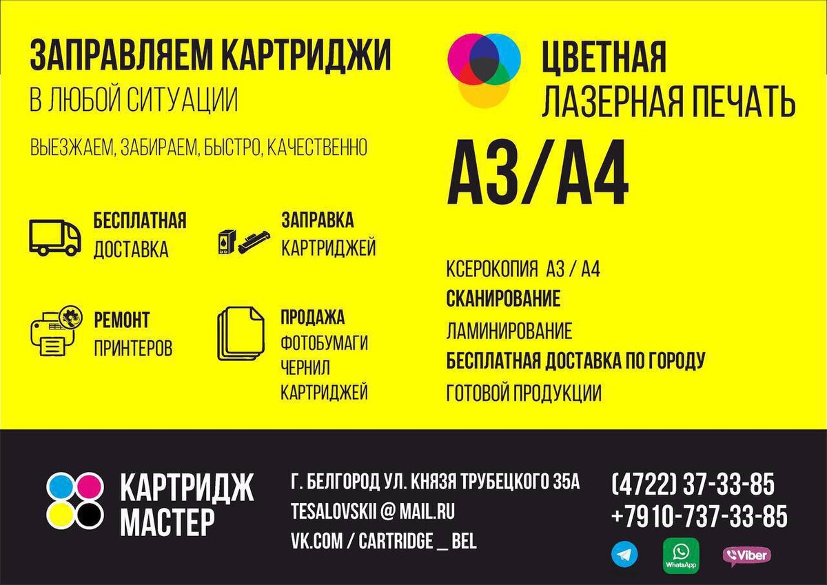 erid: 2VfnxxVAVrp Белгородский сервисный центр «Картридж мастер» — это: 📌заправка и восстановление струйных и лазерных картриджей; 📌ремонт принтеров, копиров; 📌цветная печать формата А4 и А3; 📌продажа картриджей, чернил, фотобумаги; 📌бесплатная доставка по городу и району. По всем вопросам звоните по телефону: +7-4722-37-33-85. Или приезжайте в офис в Белгороде на Князя Трубецкого, 35А. График работы: по будням с 9:00 до 19:00, по выходным — с 10:00 до 15:00. Реклама, ИП Тесаловская Олеся Евгеньевна, ИНН 312320620227