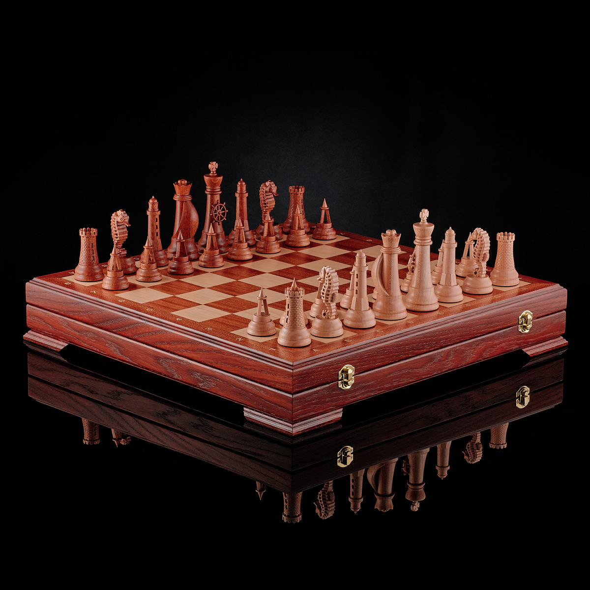 Этот комплект мы создали по индивидуальному заказу к юбилею. Основная задача: отразить любовь заказчика к морю, сохранив при этом классическую читаемость фигур и удобство игры. Каждая фигура — результат диалога клиента и мастера: ⚓ Пешки — миниатюрные буйки; 🏰 Ладьи — морские форты; 🐎 Кони — морские коньки; 🌊 Слоны — маяки; 👑 Ферзь украшен парусами и тремя шарами в навершии; 🛞 А король — с морским штурвалом в основании. 🔹 Материалы премиального уровня: — Красное дерево и клён для фигур, — Массив ясеня для доски, — Инкрустация орехом, кленом и красным деревом. Мы проработали эскизы, подготовили 3D-модели и изготовили комплект за 1,5 месяца. В результате получился не просто набор, а именной арт-объект с характером. 📩 У KADUN нет шаблонов. Каждый наш набор создаётся вручную — без поточной сборки, без компромиссов. Только индивидуальный подход, внимание к каждой детали и желание сделать не просто набор, а предмет высокого искусства, который хочется передавать по наследству. Готовы с