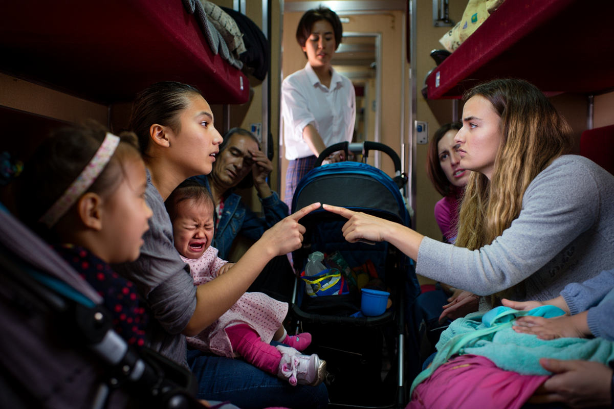 В противоположных концах купе две женщины одновременно пытались устроиться рядом со своими маленькими армиями: у Ольги была тонкая, чуть дрожащая коляска, в которой сопел новорожденный, у Марины — два пластмассовых рюкзака и ребенки лет трех и шести, которые уже на этапе посадки затеяли возню, будто это не поезд, а детская площадка.